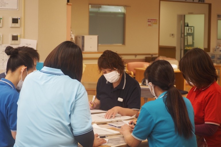 フロアが広く、利用者さんの数も多いため、業務を進める上では多職種との連携が欠かせません。日々、介護職、リハビリ職の方と密にコミュニケーションを取りながら、利用者さんの体調や生活の様子を共有しています。多職種の方も利用者さんの健康状態を把握してくれているので、安心して業務に取り組むことができます。
